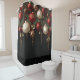 Pretty Christmas shower curtain with beautiful shiny red, white and gold ornaments, pine branches and holly leaves against a black background