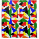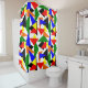 Ce rideau de douche a une conception Bauhaus d'un collage de triangles en rouge, jaune, orange, bleu et vert.