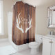 Rideau en douche en bois rustique brun-foncé de planches avec la silhouette blanche d'andouillers de cerfs communs et votre texte personnalisé.