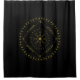 Cycles shower curtain. Cycles is a Germanic design created by Anna M. Asbury and consists of a black background with an Aegishjalmr in the center and encircled by Elder Futhark Runes. The design is enclosed in a diamond with the Ingwaz Rune, flanked on all four sides with a bind rune, and encircled by the Jera and Ingwaz Runes.