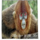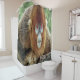 rideau de douche singe avec un singe qui vous regarde avec les yeux rouge vif. L'arrière-sol est une couleur de forêt verte et brumeuse.