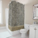Sur ce rideau de douche design se trouve un rideau doré et chatoyant avec un empreinte de léopard doré et un fond gris brillant. Vibes glamiques. Parfait pour tous les thèmes ou décors léopard.