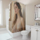 A dreamy portrait of a woman with captivating green eyes and flowing wavy hair, gazing thoughtfully out of a window bathed in soft natural light. This image embodies serene beauty and ethereal charm, perfect for art prints, home decor, and a variety of personalized products.