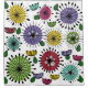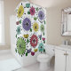Ce rideau de douche est d'inspiration scandinave et présente des fleurs en cercles, ovales et demi-cercles avec des éclats d'étoile sur eux et des feuilles en perwinkle, jaune, vert, turquoise, magenta, rouille et bleu.