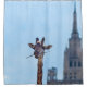 Une girafe drôle avec une brindille dans la bouche contre l'arrière - plan du ciel bleu, grand gratte-ciel et petit nuage blanc. Encore Un Bite Pour Atteindre Le Ciel. Véritable scène. Tous les éléments ont été assemblés naturellement. Simulation de peinture à l'huile à partir d'une photographie. rideau de douche pour décorer votre salle de bain pour le plaisir et la bonne humeur.
