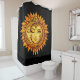 This striking sun-and-moon boho goddess artwork features a radiant golden winking face surrounded by fiery mandala rays. Symbolizing balance, intuition, and feminine strength, this piece represents harmony between day and night, mind and spirit. This beautiful black shower curtain is perfect for anyone drawn to celestial symbolism and unique spiritual art. | The matching bath mat is available in my store.