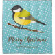 Ce rideau de douche à thème de Noël personnalisable en bleu présente l'illustration originale de Destei d'un joli Grand Tit / Parus Major oiseau. L'oiseau a des couleurs jaunes et noires. La couleur arrière - plan est bleue avec un motif de neige blanche. Sous l'oiseau on lit "Joyeux Noël" en marron et il y a aussi une zone de texte personnalisable pour un nom de famille, par exemple.