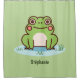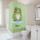 Un rideau de douche vert avec une illustration d'une grenouille mignonne sur son étang et texte personnalisable ci-dessous! Parfait pour ajouter une touche amusante à votre salle de bain !