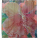 L'abstraite décoration florale tropicale de ce rideau de douche a commencé comme une photo originale d'une fleur d'hibiscus orange. La fleur de la photo a des couches de pétales rouillés dans des teintes douces de pêche, rose et jaune. Les couches abruptes sont entourées d'un arrière - plan de vert pastel et de bleu. Le design a une texture avec l'aspect de tissu piqué.