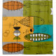 Poissons modernes art. de rideau en douche de la moitié du siècle lunatiques et poissons d'amusement grands dans l'orange, avocat sur un arrière - plan turquoise et gris avec de diverses formes abstraites.