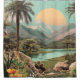 Paysage tropical animé avec un lac serein entouré de verdure luxuriante et de palmiers. En arrière - plan, des montagnes majestueuses s'élèvent sous un grand soleil jaune pâle. Le premier plan est orné de fleurs et de rochers colorés, ajoutant profondeur et texture à la scène.
