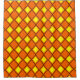Ce rideau de douche a une conception des années 1970 de diamants jaunes solides à l'intérieur des contours de diamants bruns sur un champ d'orange.