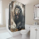 Ce rideau de douche a un lion effrayant représenté dessus.