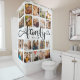 Un rideau de douche photo collage personnalisé moderne avec espace pour 20 photos entourant un script tourbillonnant tendance lisant FAMILY et votre nom personnalisé ci-dessous. Faites un brin avec ce décor de salle de bain personnalisé et amusant!
