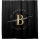 Fille, moderne, élégant, minimaliste noir et or monogramme nom initial script personnalisé monogrammed rideau de douche. Doté d'une initiale monogramme et d'un script de signature de nom girly dans une police de calligraphie à la main avec des queues d'échange et un cadre de cercle pointillé autour de votre nom. Un cadeau féminin parfait pour toute personne qui aime un style simple et assez élégant.