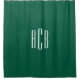 Conception moderne de monogramme de trois lettres en blanc sur rideau de douche vert chasseur solide. Une police mince de style minimaliste 3 design initial fonctionne pour un monogramme mariage ou pour un individu. Customisez la taille, la couleur ou le placement de la police selon vos besoins.