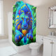 Ce rideau de douche a un lion d'art dessus.