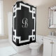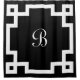 Une bordure de clé grecque blanche encadre un monogramme en caractères blancs sur un arrière - plan noir. Customisez facilement avec votre propre initiale. Fait également un grand cadeau de ménage personnalisé!