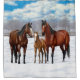 A family of bay quarter horses in their winter ranch corral.