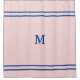 Ce rideau de douche rose pâle a deux lignes horizontales bleues et profondes qui se trouvent en haut et en bas. Une lettre bleue profonde est au centre. Vous pouvez modifier la lettre pour afficher le monogramme correct.