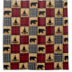 rideau de douche rustique avec patchwork de buffle rouge et noir en alternance avec des taches de revêtement en bois. Les ours et les pins se mélangent au motif. Parfait pour votre maison de montagne ou location de vacances.