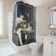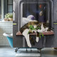 Un mignon chat tabby dormant sous une fenêtre de vaisseau spatial sur son lit de chat avec son jouet en peluche mignon alien vert