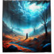 Ce rideau de douche a une personne debout au loin dans une scène solitaire.