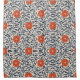 Seamless floral pattern with vibrant orange flowers and navy blue leaves on a beige background, creating an ornate, symmetrical design.