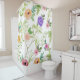 Ce rideau de douche Shabby Chic Floral présente des fleurs roses, des fleurs jaunes, des fleurs violettes et des fleurs rouges sur un terrain de feuilles verts.