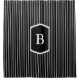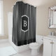 This black shower curtain has an initial that you can change to show the correct monogram. The letter is white and is framed. Vertical black and white stripes are in the background. This shower curtain has a classic black and white color scheme.