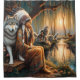 Dans un cadre forestier serein, une Indienne, ornée d'une tenue traditionnelle, est assise à côté d'un loup majestueux. Entourés d'une famille de loups, ils partagent un moment de silence au coucher du soleil, jetant une lumière chaude sur les eaux paisibles.