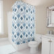 Ce rideau de douche a un design art déco de diamants bleus poussiéreux avec des lignes diagonales et des diamants bleus foncés sur un champ de blanc.