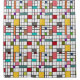 Ce rideau de douche a un design moderne du milieu du siècle d'une grille de lignes noires avec carrés et rectangles aux couleurs rétro sur un champ de blanc.