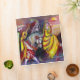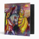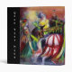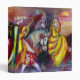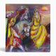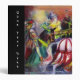 Elegant ,whimsical,artistic painting with magic colourful musical nocturne,moon,faeries,horses in vibrant blue green,red,yellow,white colours .Acrylic painting on canvas, mixed media painting with golden and silver foil .
