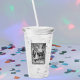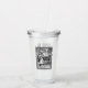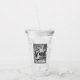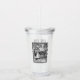 This acrylic drink tumbler with straw and lid has a a black and white illustration of LIttle Red Riding Hood talking to the woods on her way thru the woods under trees wearing a hooded cape in an ornate black frame on the front and back.