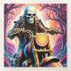 a skeleton gripped in pandemonium bike. Riding through the intertwining branches on the trail .He had a hopped-up .He has a black leather trousers and motorcycle boots And a black leather jacket with bone like design on the bilker outfit .With the sun going down behind him. Haze rising up from around him into the dark night he rids away with night stars above.