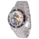 Has heft and feel of expensive stainless steel quartz watches. Good band with safety catch. I removed links, which is easy because engraved arrows show direction to push the linking pins. As always by this seller, the image (a railroad logo) is a perfect reproduction of my emailed image, and is precisely spaced and aligned.