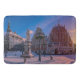 Sunset over covered in snow Riga Town Hall Square in winter in Riga, Latvia. View of famous House of the Blackheads and Roland's Statue against blue sky with sunset lights.