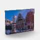 Sunset over covered in snow Riga Town Hall Square in winter in Riga, Latvia. View of famous House of the Blackheads and Roland's Statue against blue sky with sunset lights.