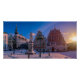 Sunset over covered in snow Riga Town Hall Square in winter in Riga, Latvia. View of famous House of the Blackheads and Roland's Statue against blue sky with sunset lights
