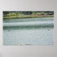 A minimalist landscape scene of a female duck gliding on the surface of the water behind her baby ducklings at a lake.