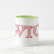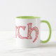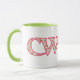 A fun Ringer Mug with a Green lip and handle and the Welsh word 'cwtch', meaning 'cuddle' or 'hug', in a Celtic script, filled with a pretty red, green and white floral pattern.