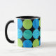 A white ringer mug with a black lip and handle and a 'Blue Moons' abstract pattern in bright blues and neon green on a black background; from a handpainted paper collage design by Judy Adamson.