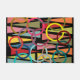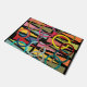 This doormat has a mid-century modern design of triangles and rings in retro colours on a field of black.