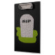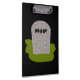 This awesome clipboard features a grey tombstone with RIP in dripping black text on it, standing on a patch of green grass. Befitting of this morbid design the background is black.