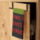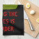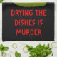 This awesome kitchen towel features a grey tombstone with RIP in dripping black text on it, standing on a patch of green grass. Befitting of this morbid design the background is black. There is funny red customizable text that reads "Drying the dishes is murder"