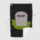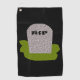 This awesome golf towel features a grey tombstone with RIP in dripping black text on it, standing on a patch of green grass. Befitting of this morbid design the background is black.