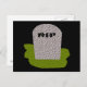 This spooky postcard features a grey tombstone with RIP in dripping text on it, standing on a patch of green grass. Befitting of this morbid design the background is black.