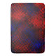 Riscos vermelhos com tons mais claros e escuros que foram cruzados e passados em um filtro que os modificou de maneira que não se percebe mais serem riscos, mas, parecem formas quase quadradas sobre um fundo azul, podendo causar a percepção de profundidade no azul.