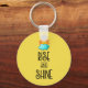 A keychain with a cute typographical design. A fluffy cloud and an orange sun.